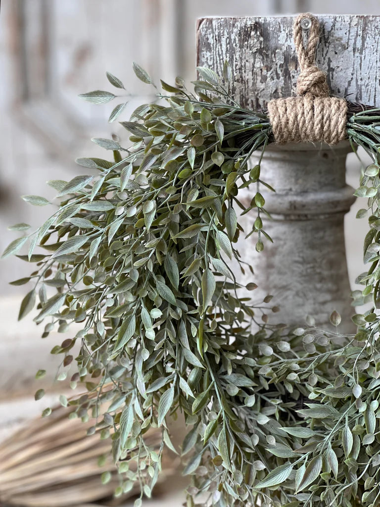 An airy collection that features an abundance of petite, mixed leaves. Sweet and delicate, it pairs well with other items. The rope wreath adds an extra element of charm with its rope accent/hangers.